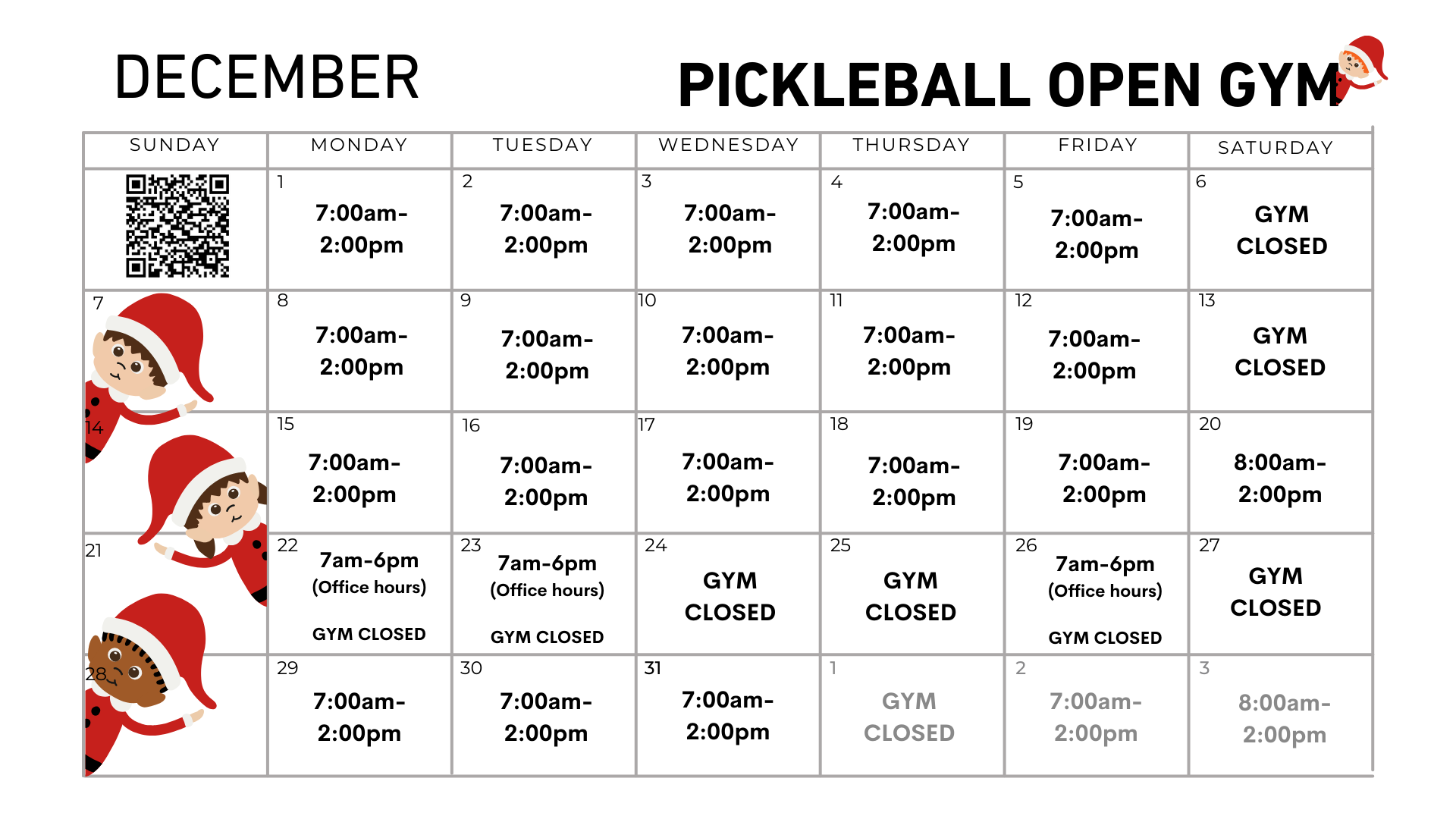 SATURDAYS: 8:00 a.m. – 2:00 p.m. (Pickleball: 3 courts & Basketball: half gym) (program dependent, call for questions)